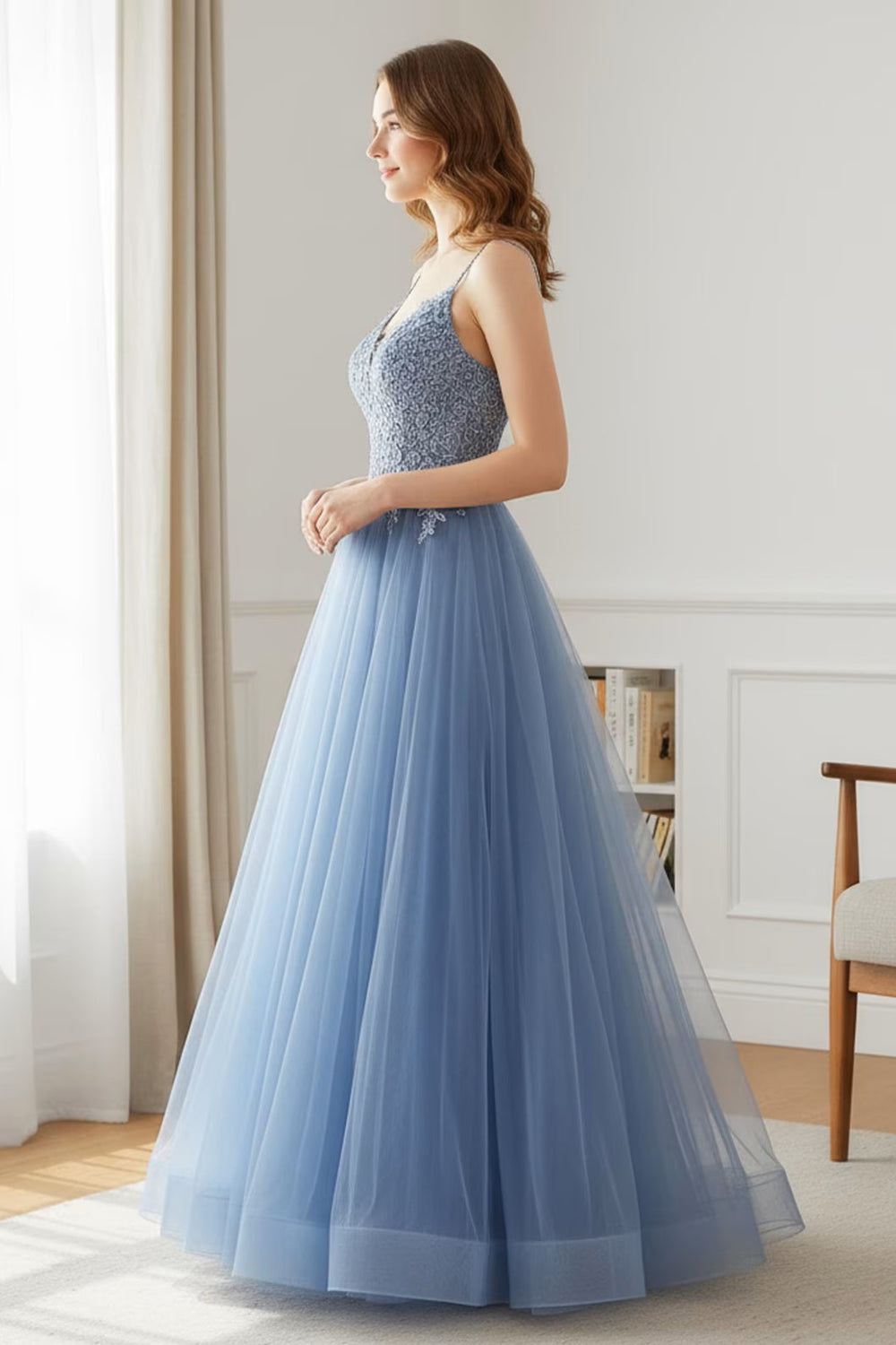 Make an enchanting entrance in this blue prom dress! Designed as a whimsical fairy ball gown, it features intricate floral embroidery and a flattering V-neckline. This ethereal look is the perfect choice for a junior prom dress, blending youthful charm with royal elegance. Shop now to start your fairytale!