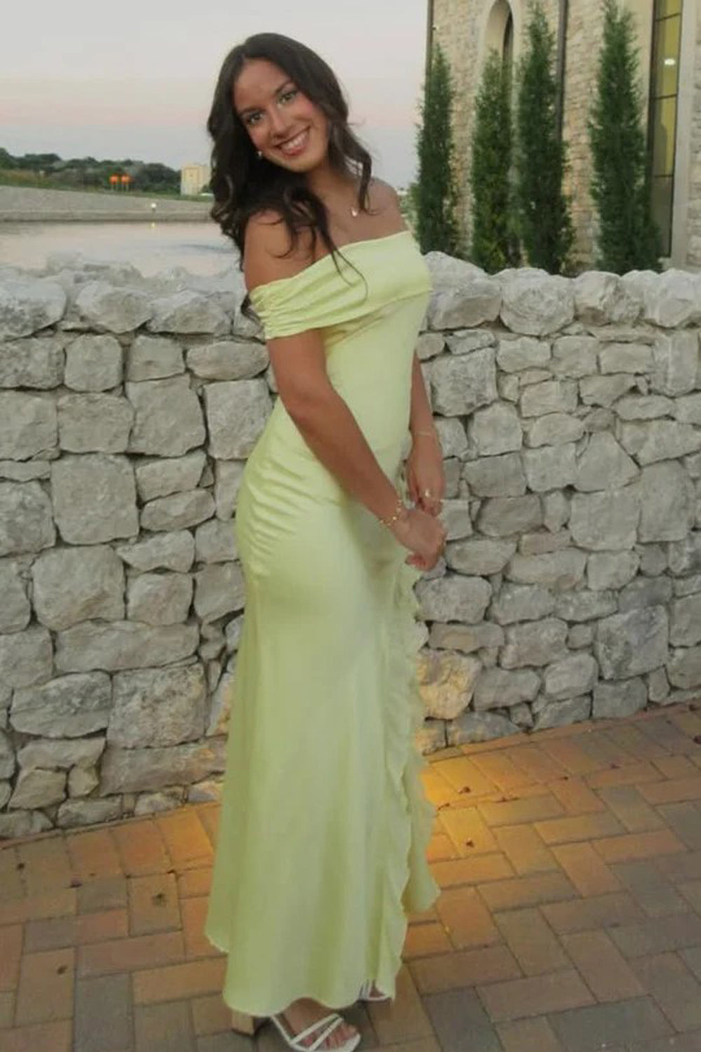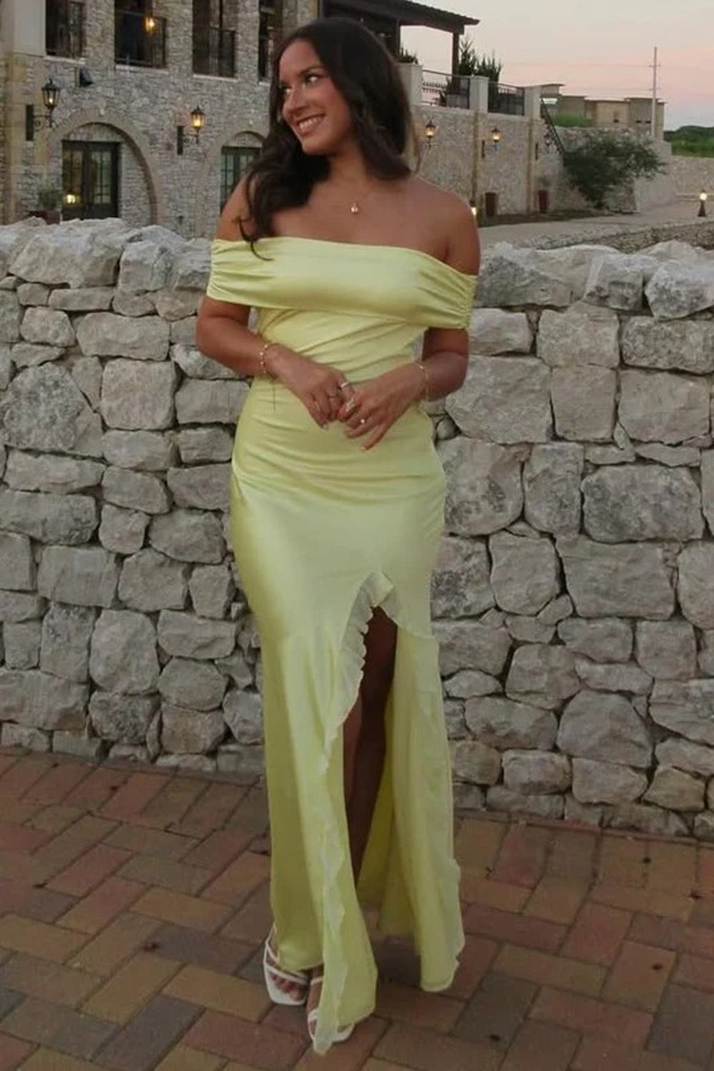 Brighten up the room in this vibrant yellow prom dress! Featuring an elegant off-shoulder neckline, sophisticated pleats, and playful ruffles, this maxi gown includes a bold slit for a modern edge. It is the perfect cheap prom dress for making a high-end statement on a budget. Shop now to steal the show!